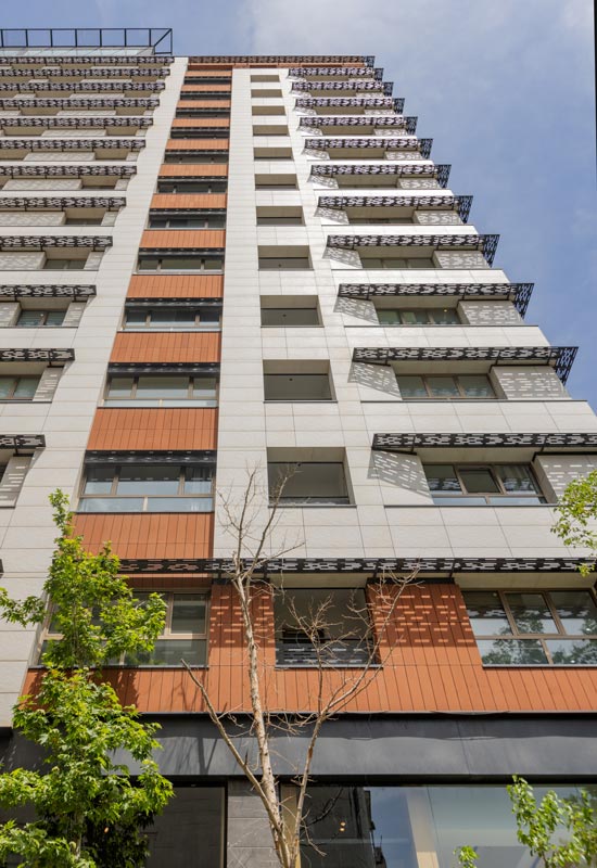 نمای ساختمان با آجر انگلیسی متشکل از رنگهای قرمز، قهوهای و این دو طیف رنگی میباشد که با یکدیگر ترکیب شدهاند. استفاده از آجرنما انگلیسی نمایی جذاب و مدرن را برای ساختمان بوجود میآورد و از طرفی حس نوستالژیکی را ایجاد میکند.